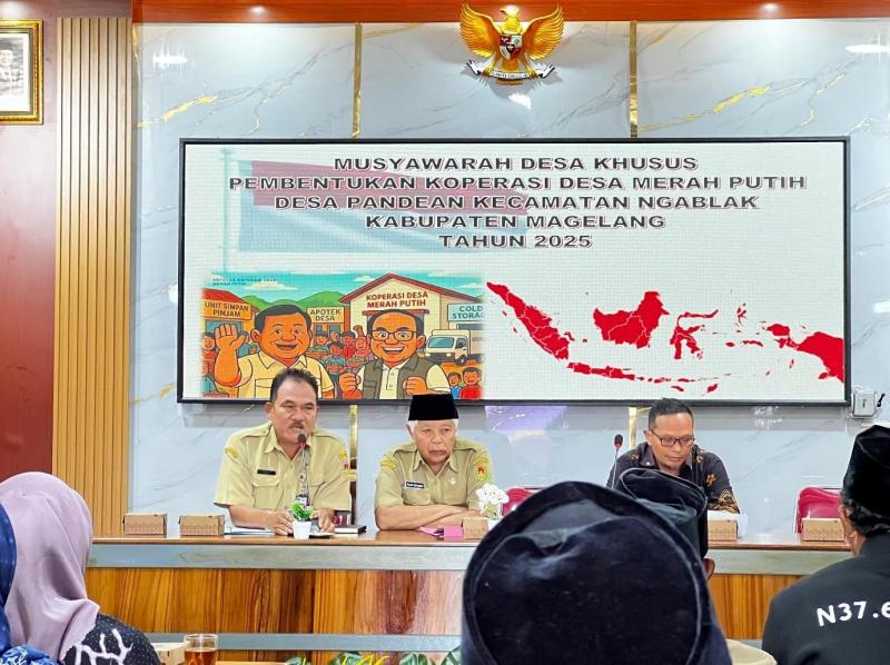 Desa Pandean, Kecamatan Ngablak, Kabupaten Magelang — Pemerintah Desa Pandean bersama segenap masyarakat desa menyelenggarakan Rapat Anggota Pendirian Koperasi Desa Merah Putih sebagai langkah awal pembentukan koperasi yang diharapkan dapat menjadi motor penggerak ekonomi lokal. Kegiatan ini berlangsung dengan antusias di Aula Rajawali Kantor Desa Pandean, diikuti oleh warga desa, perwakilan perangkat desa, dan tokoh masyarakat setempat.